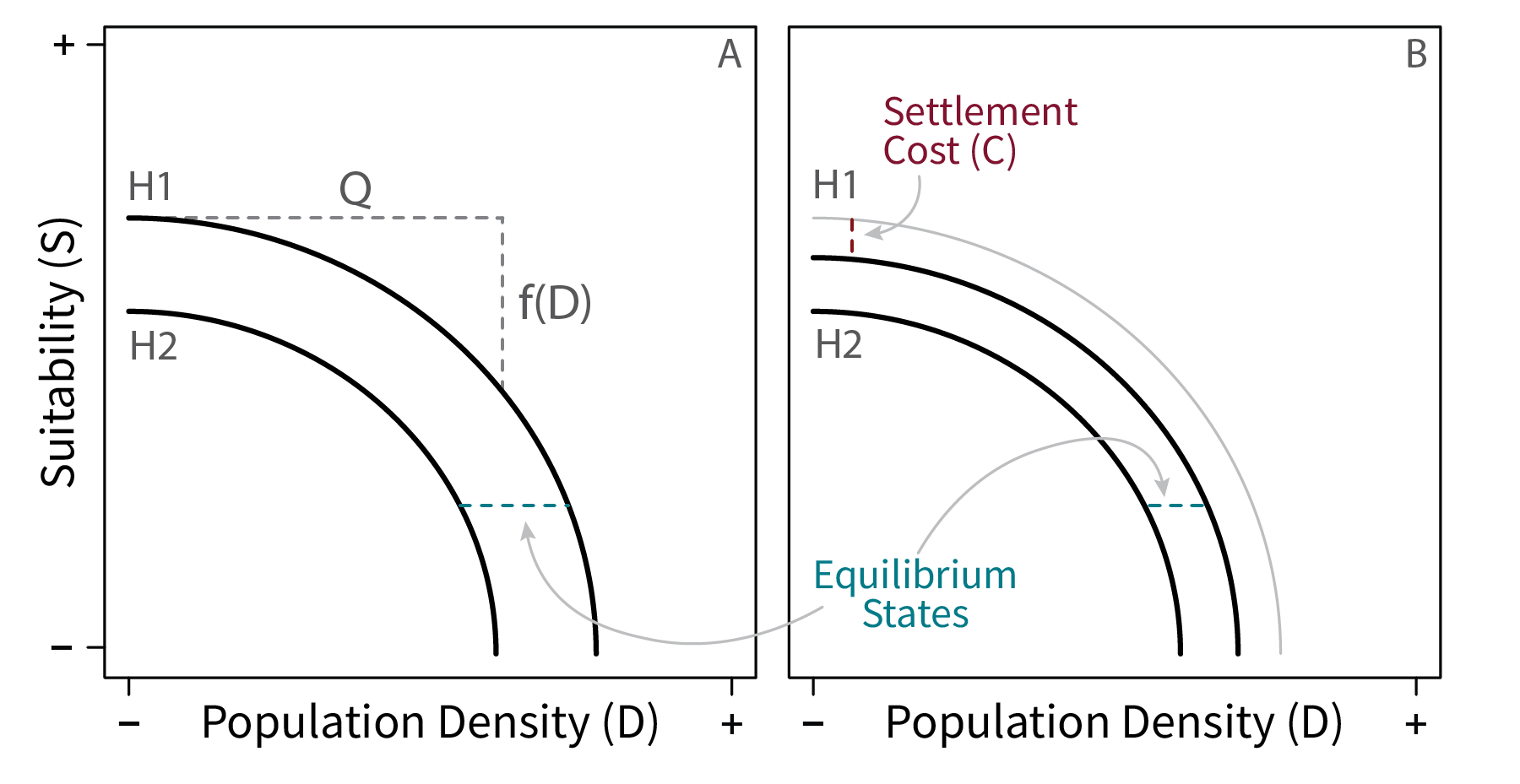 The suitability \(S_i\) of habitat \(i\) is some function of its population density \(D_i\)