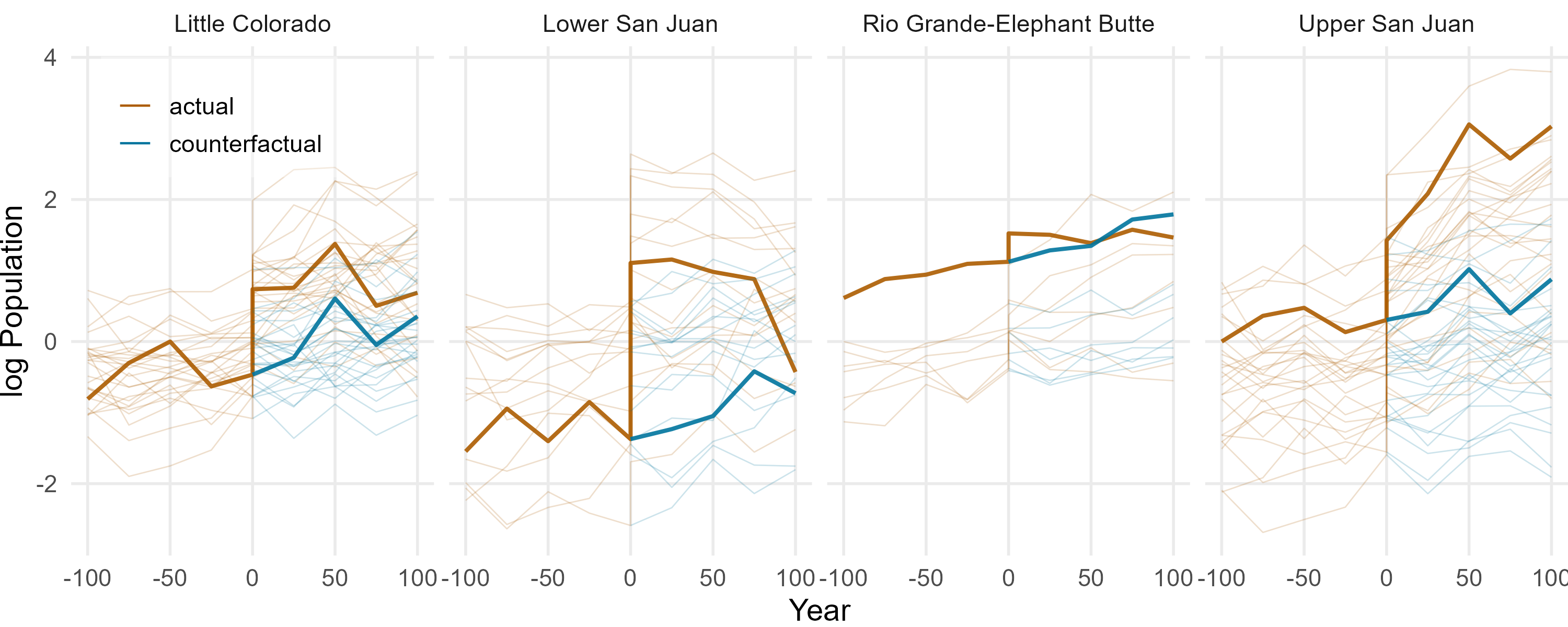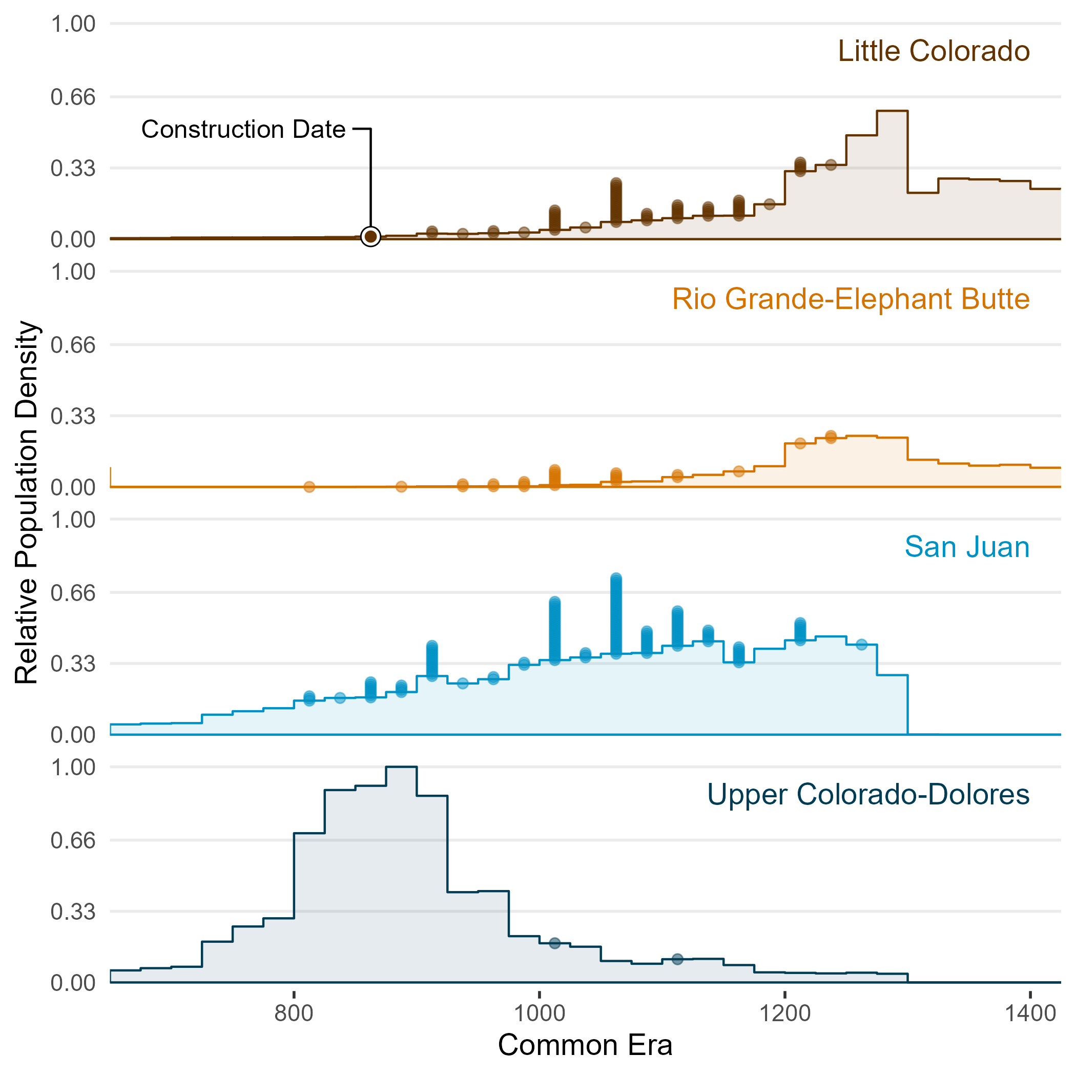 Year 0 is the first great house construction date for each watershed