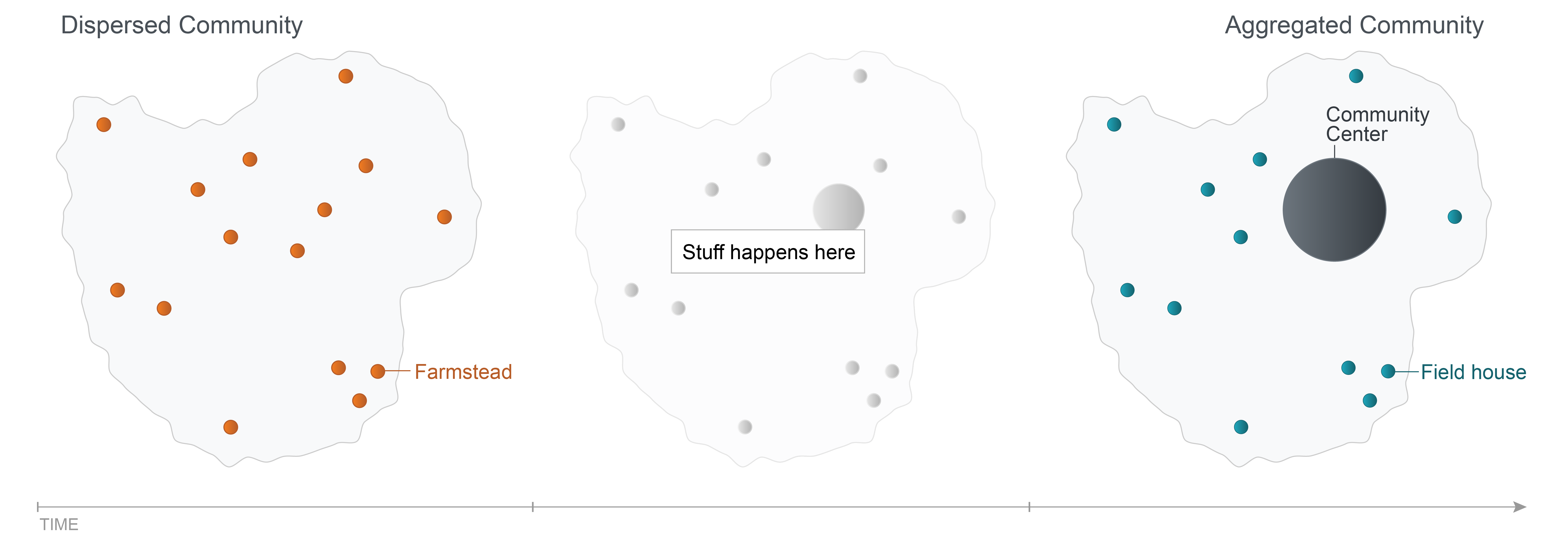 A community center is a site containing some form of civic architecture or more households than could plausibly be related by kinship.