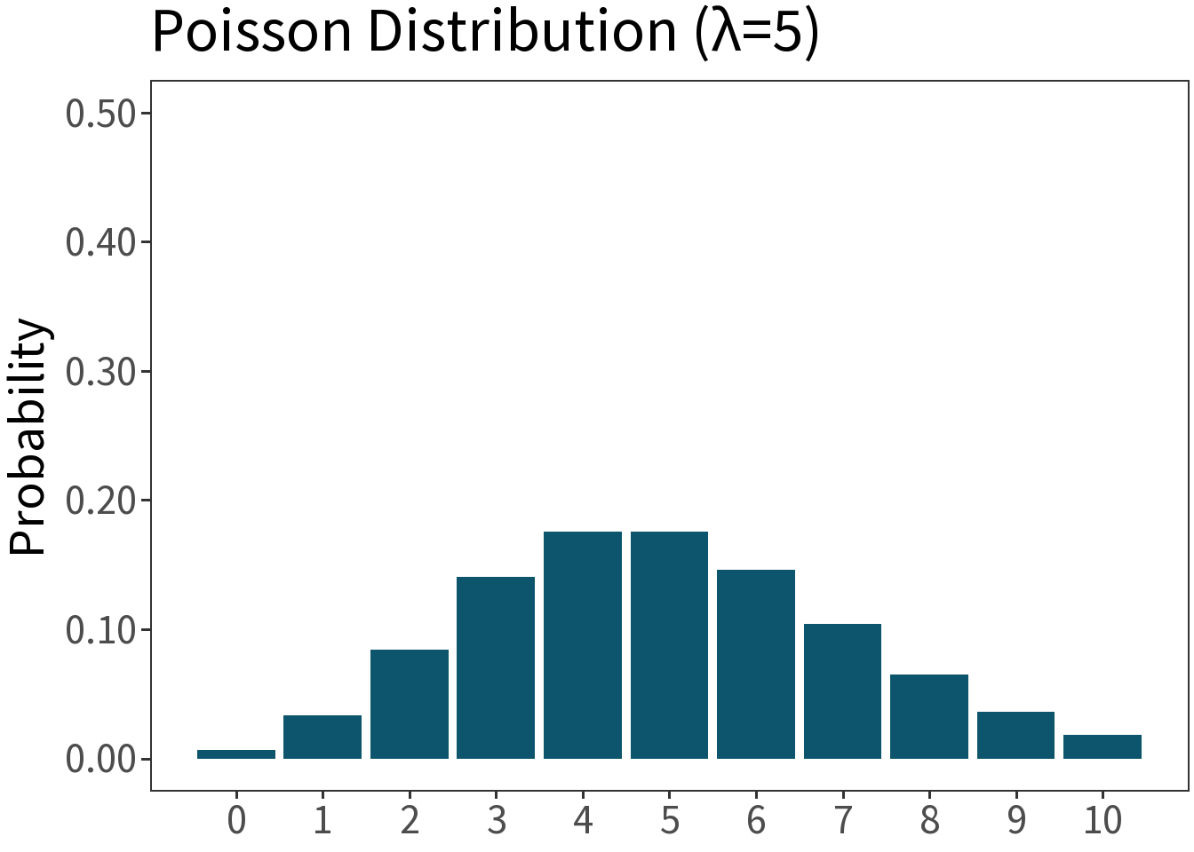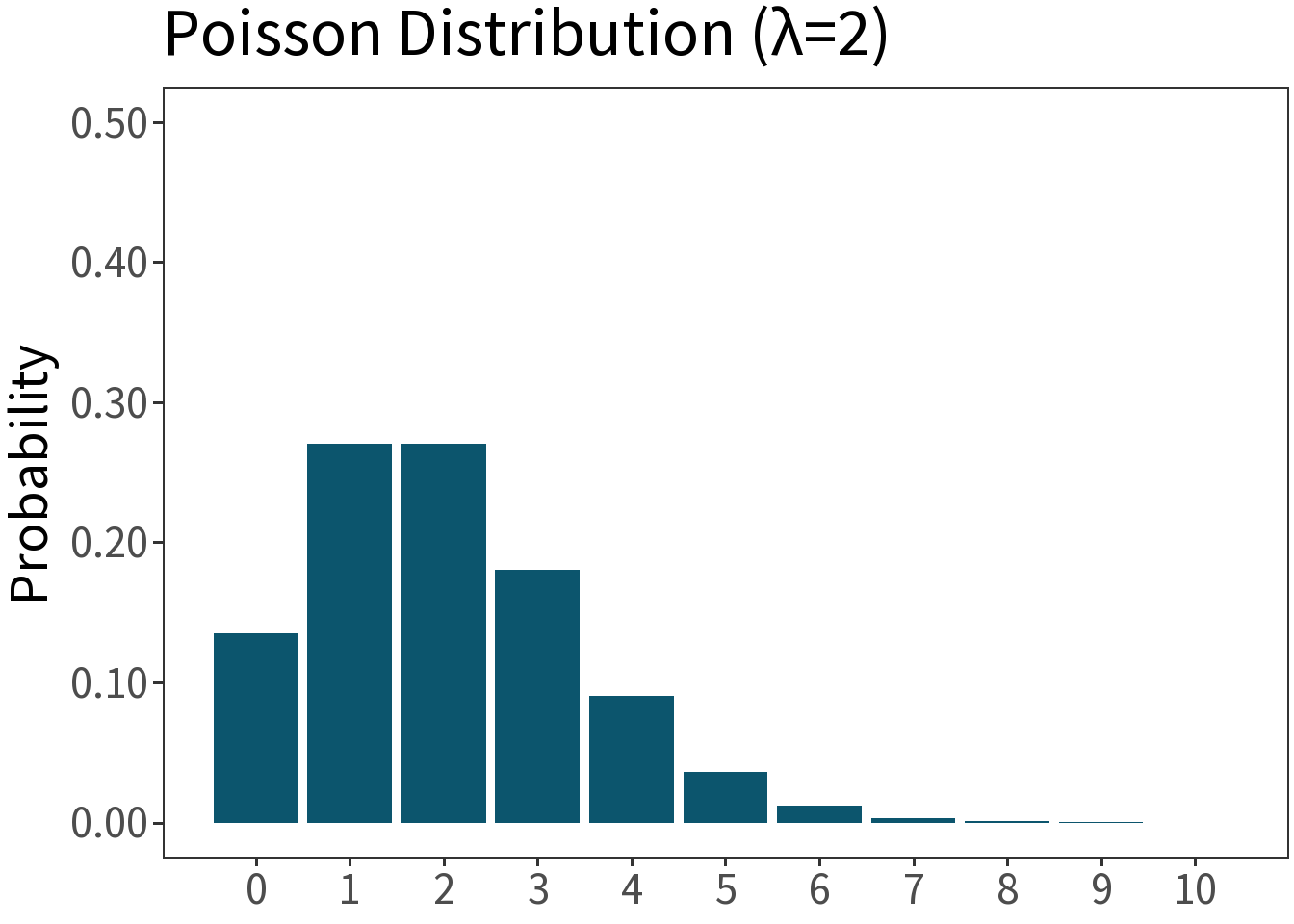 Df. distribution of a random variable whose value is equal to the number of events occurring in a fixed interval of time or space. E.g., number of orcs passing through the Black Gates in an hour.