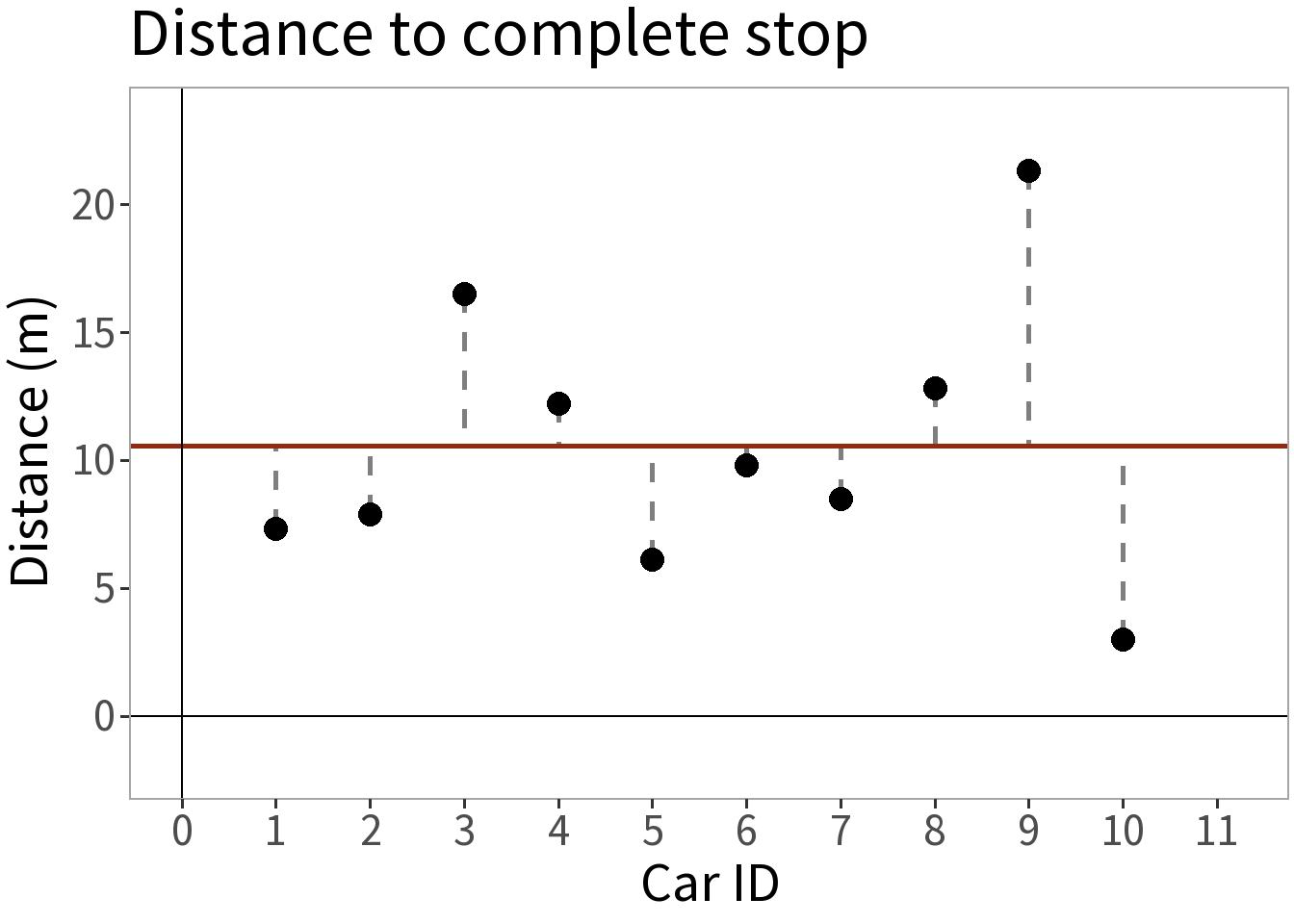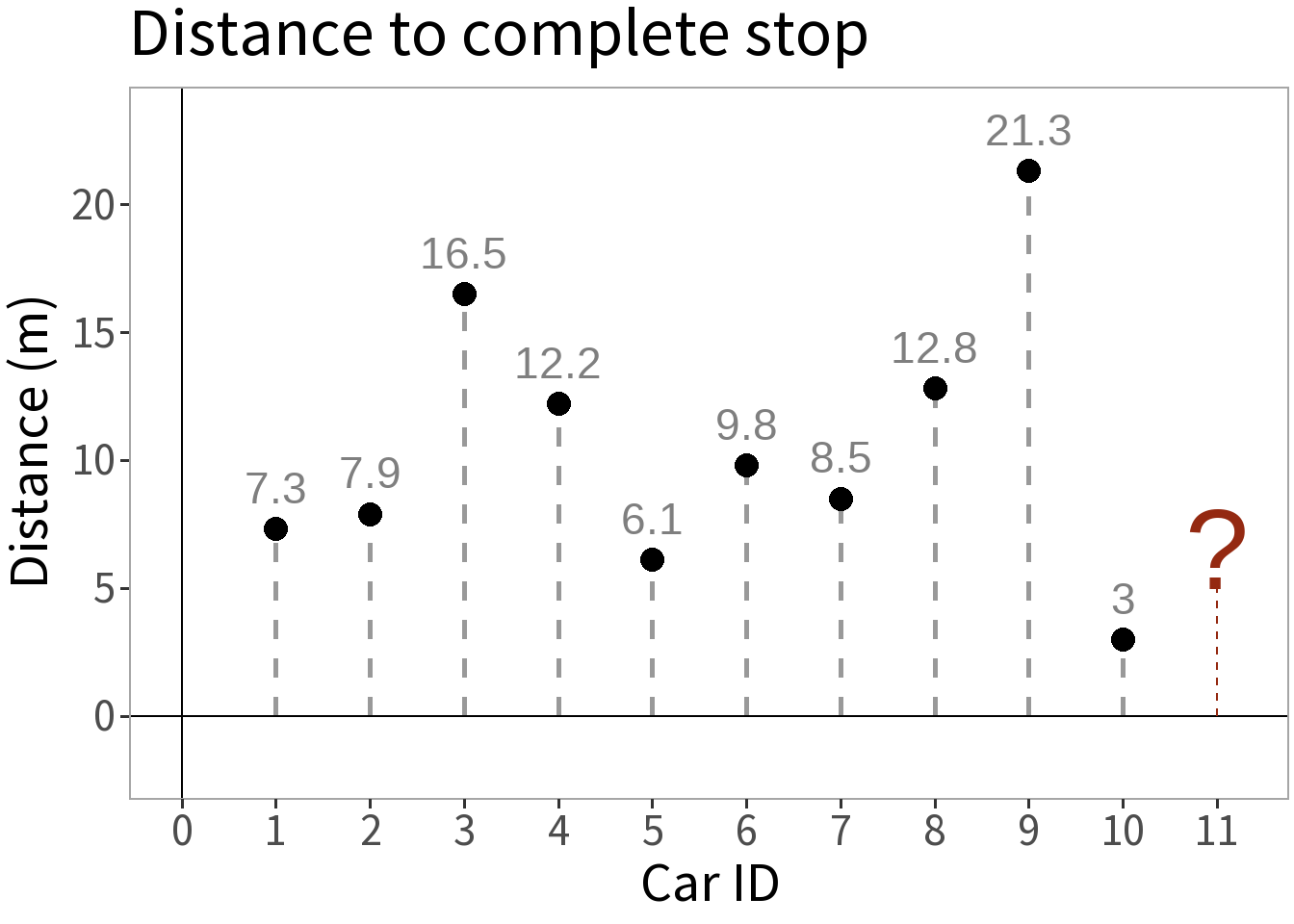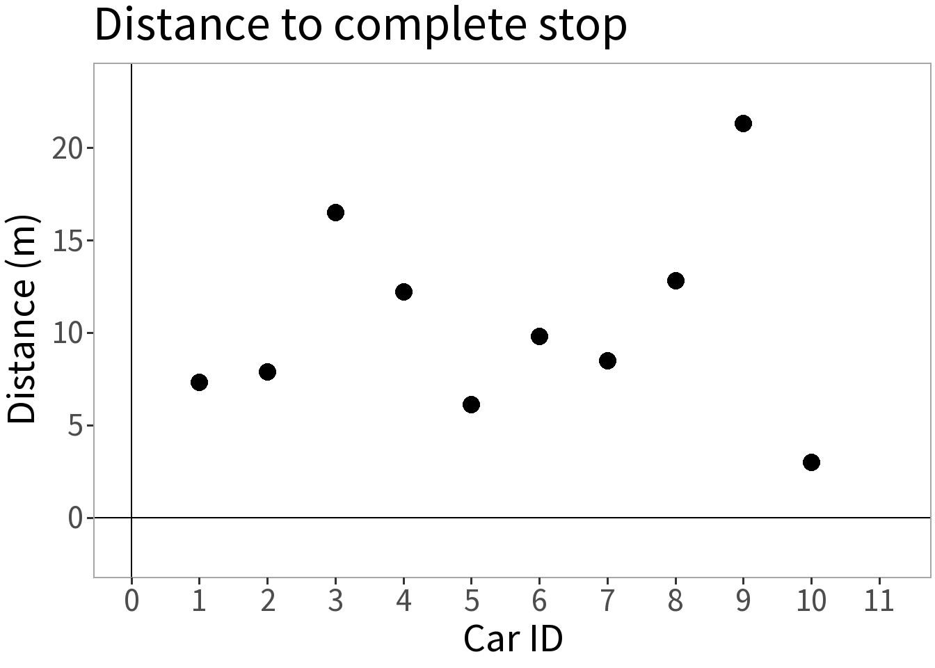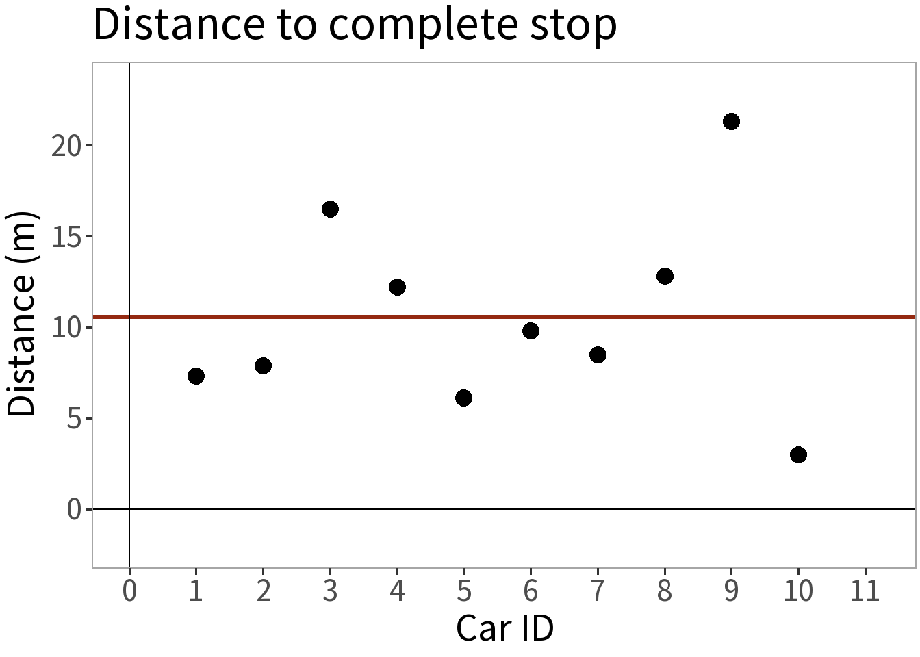 We take ten cars, send each down a track, have them brake at the same point, and measure the distance it takes them to stop.