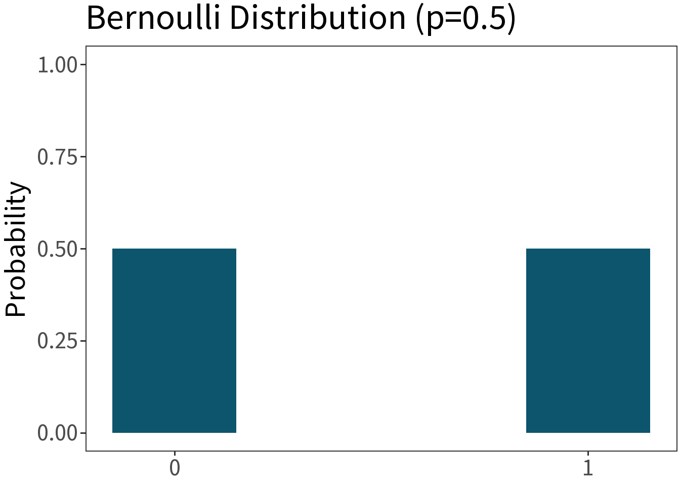 Df. distribution of a binary random variable (“Bernoulli trial”) with two possible values, 1 (success) and 0 (failure), with \(p\) being the probability of success. E.g., a single coin flip.
