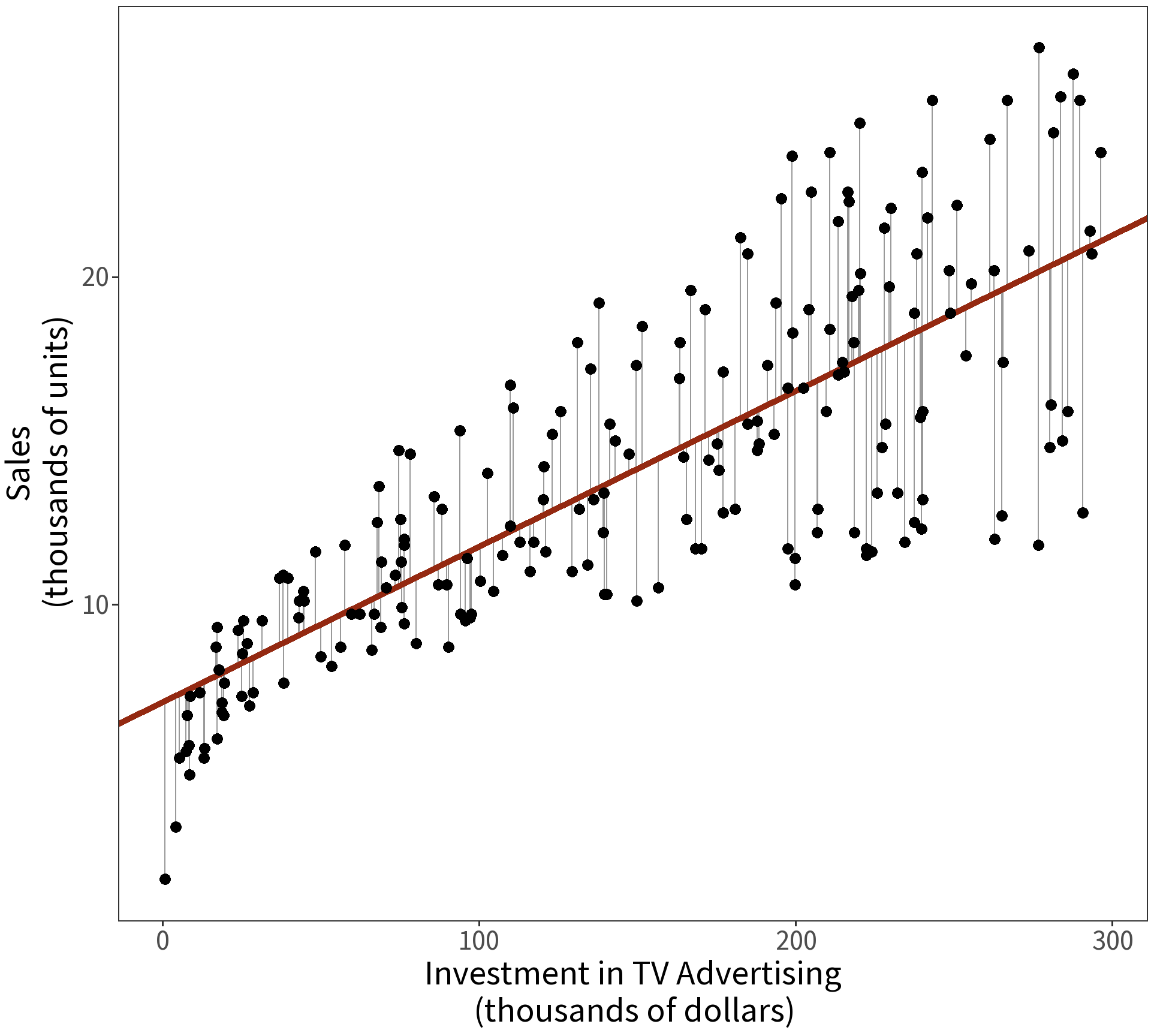 Note the units! We interpret the slope coefficient here as saying, “For every $1000 spent on television advertising, sales increased by approximately 50 units.”