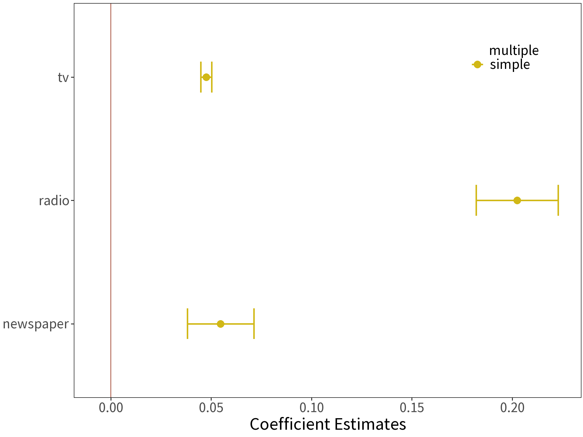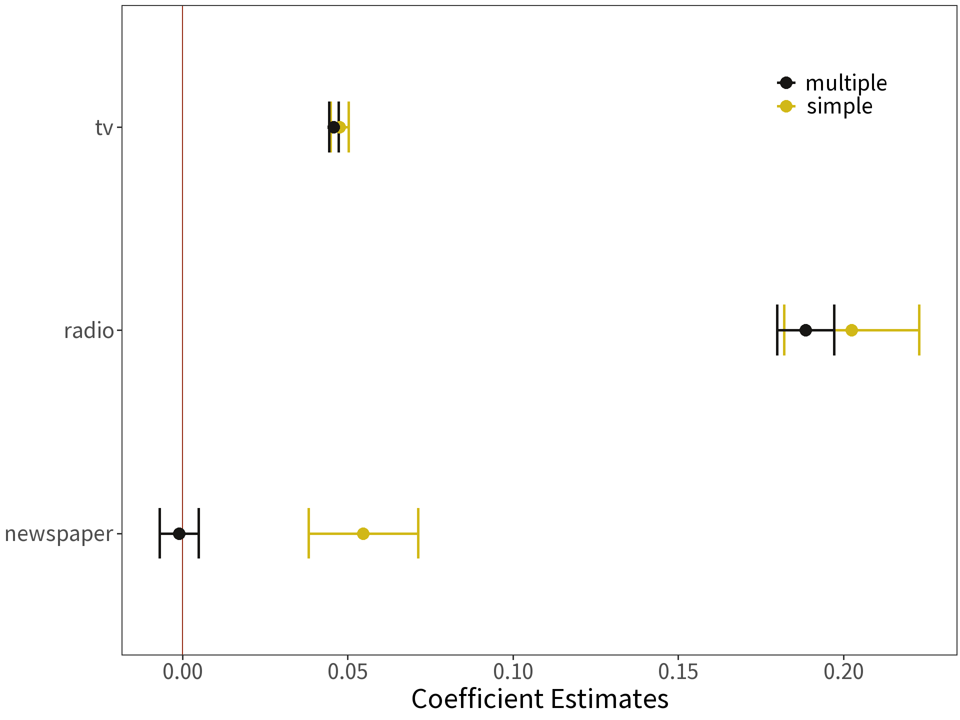 Answer: newspaper and radio advertising are correlated (\(\rho\) = 0.35).