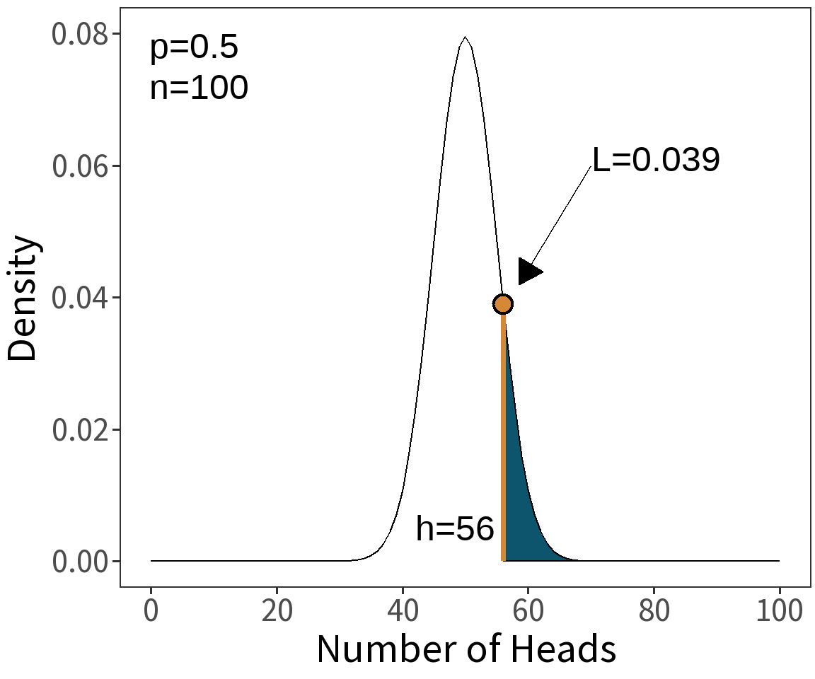 \[ \begin{align} \mathcal{L}(p=0.5|h=56) &= \binom{100}{56}0.5^{56}(1-0.5)^{100-56}\\\\ \mathcal{L}(p=0.5|h=56) &= 0.039 \end{align} \]