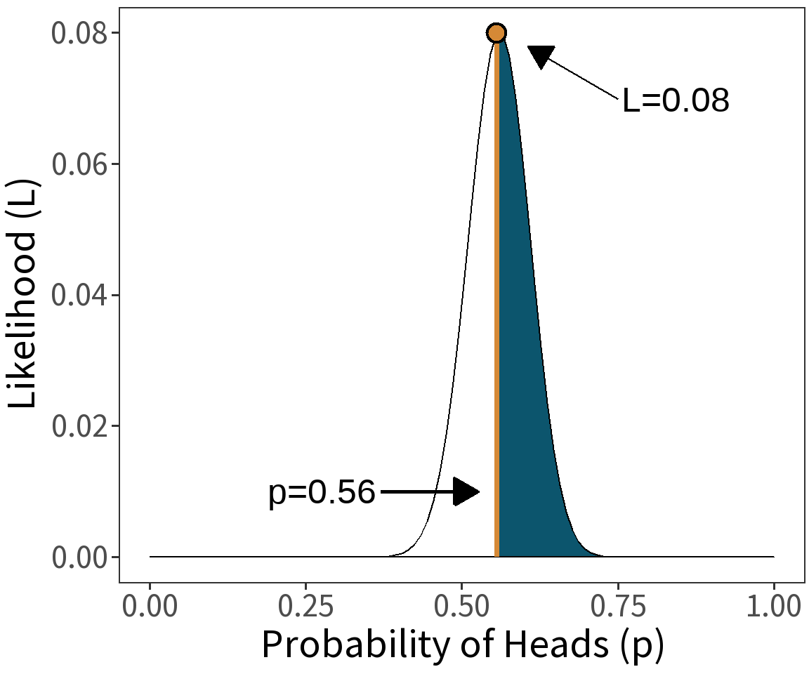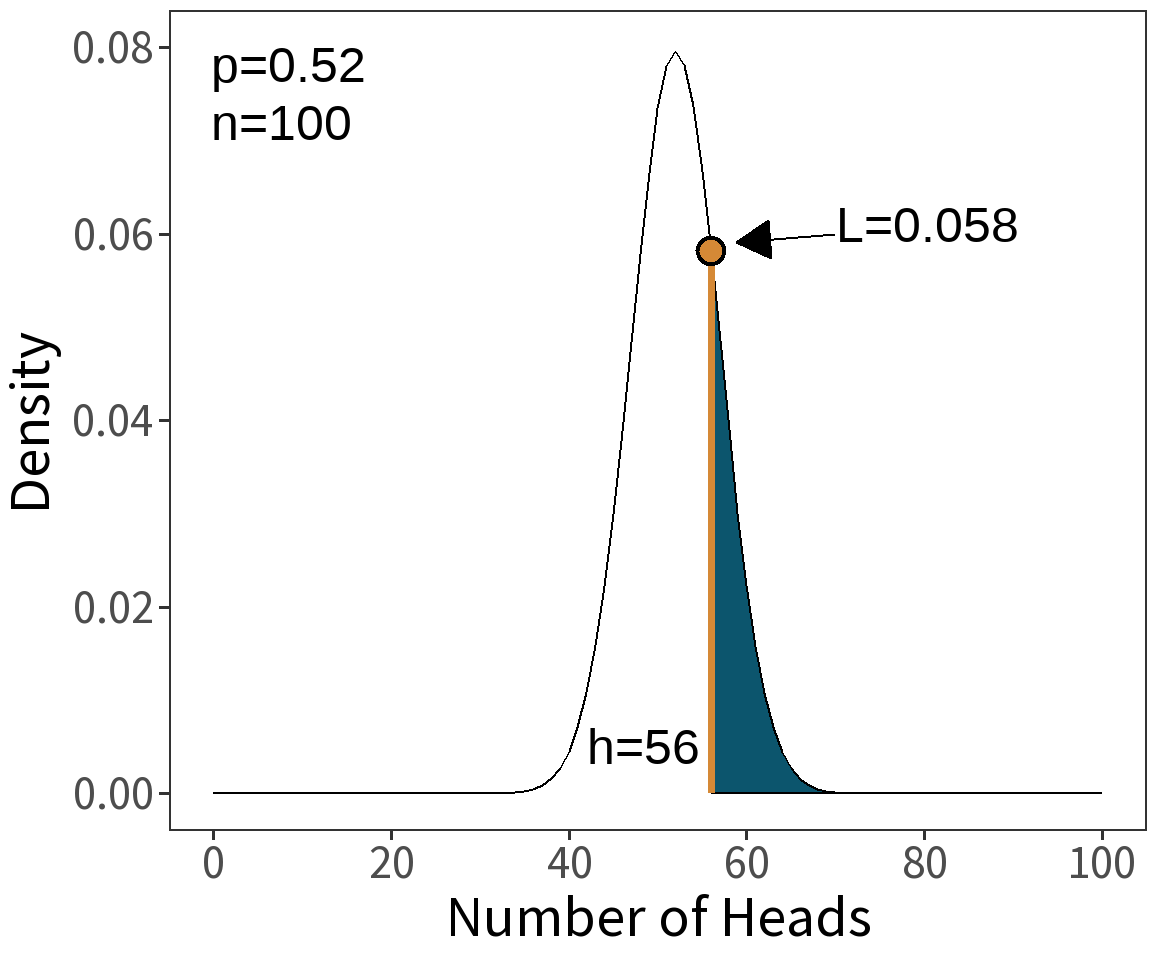 ⚠️ This is the probability that heads comes up 56/100 times assuming that the coin is biased.