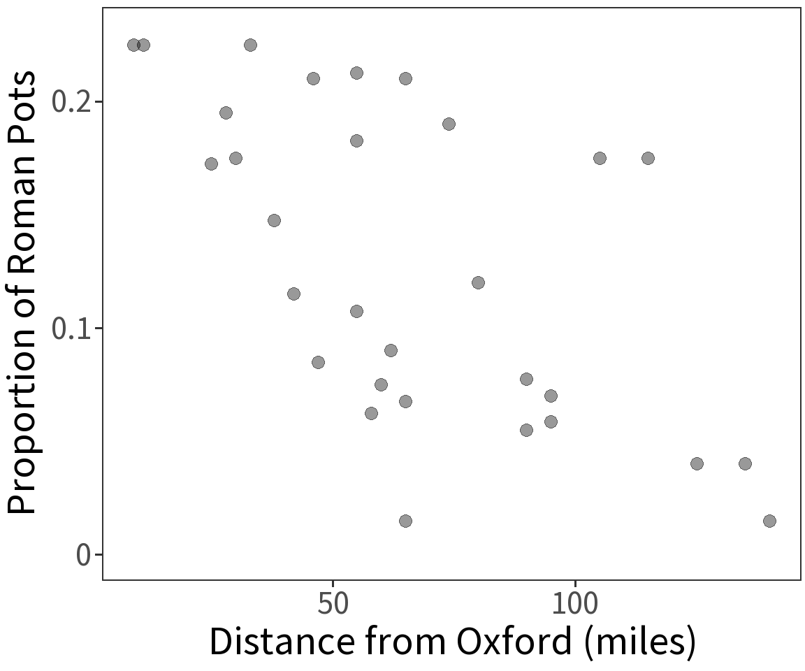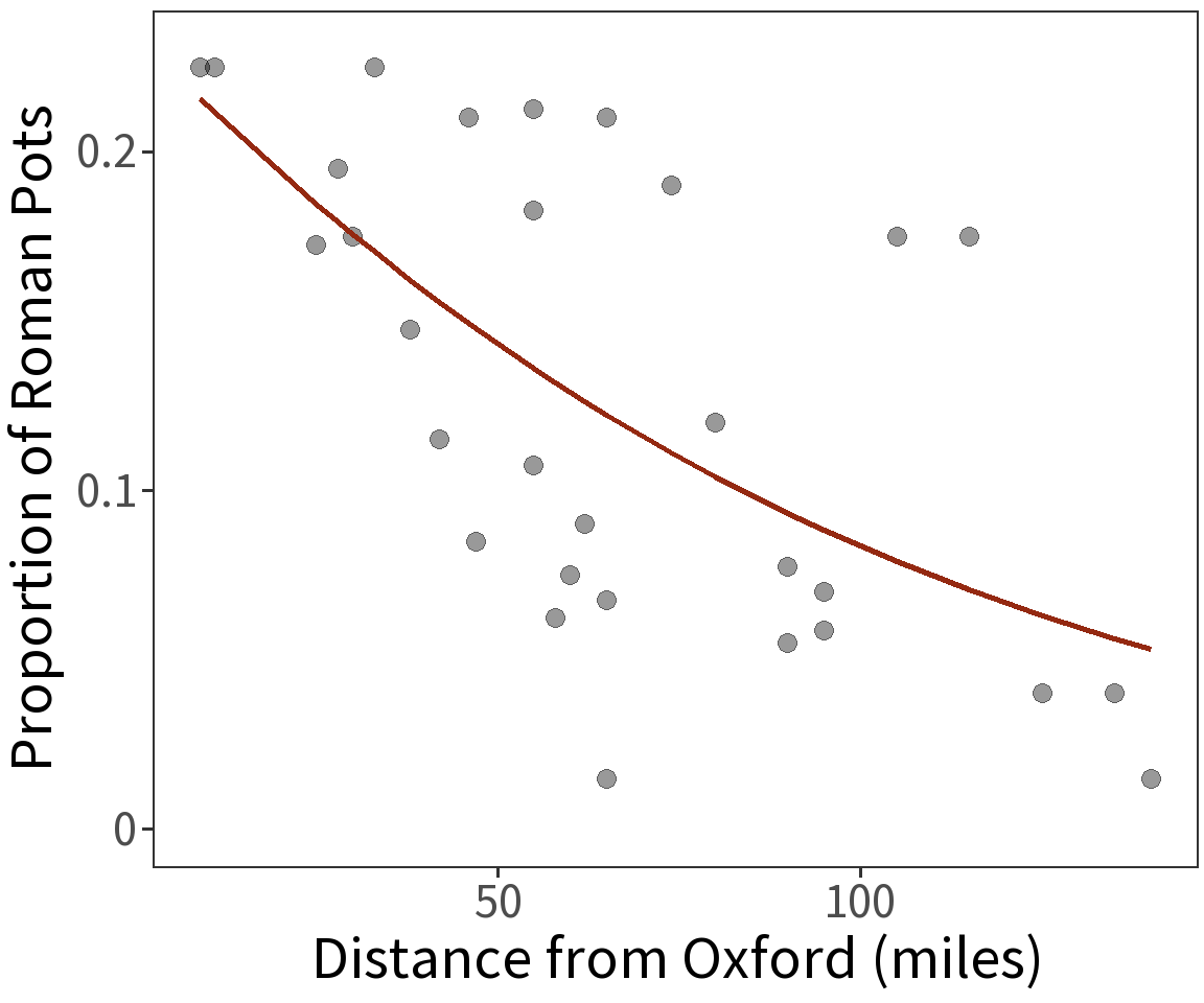 Proportion of Roman pottery is a binomial variable and has expectation \(E(Y) = p\) where