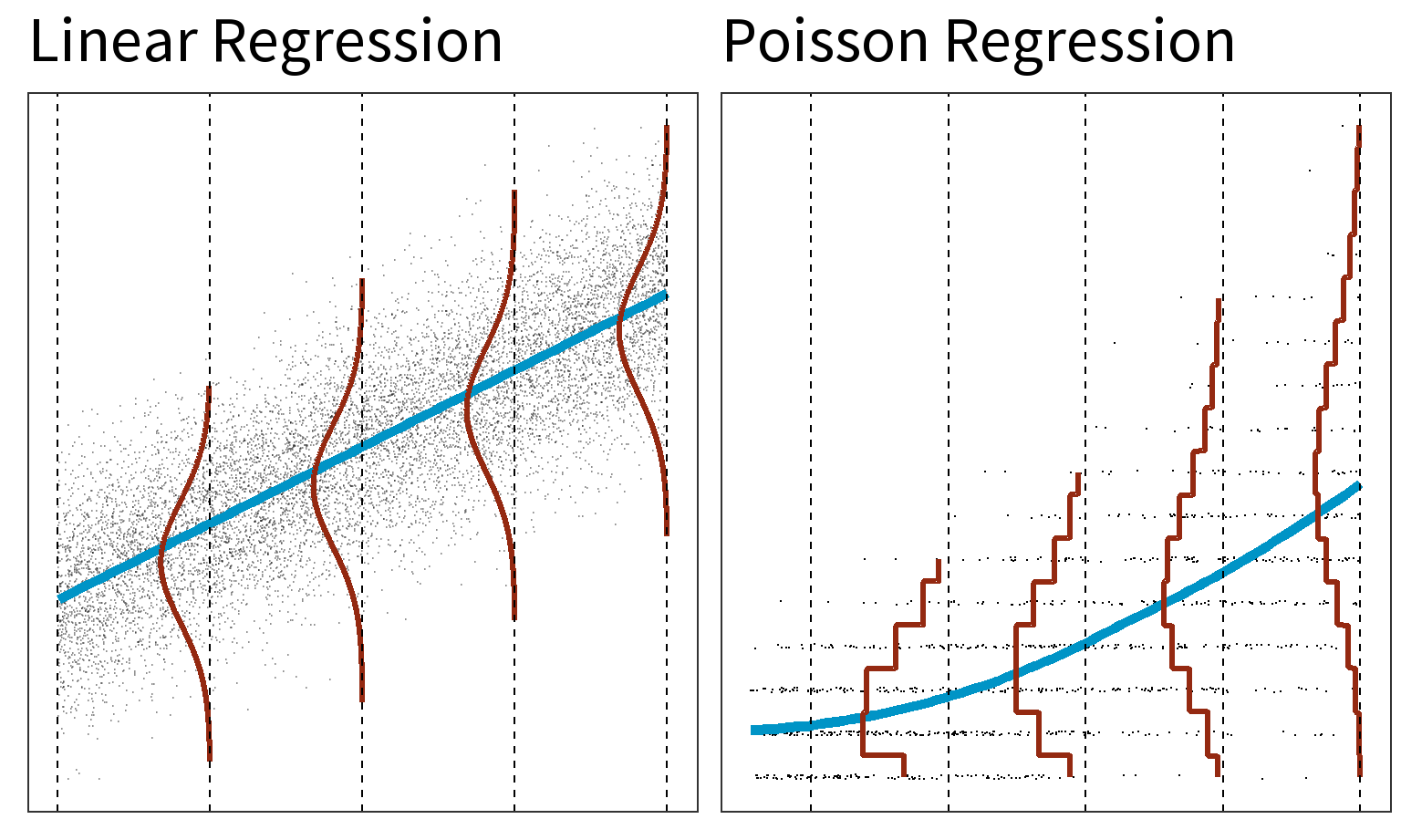Counts arise from a Poisson process with expectation \(E(Y) = \lambda\) and