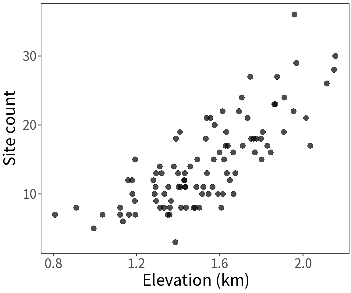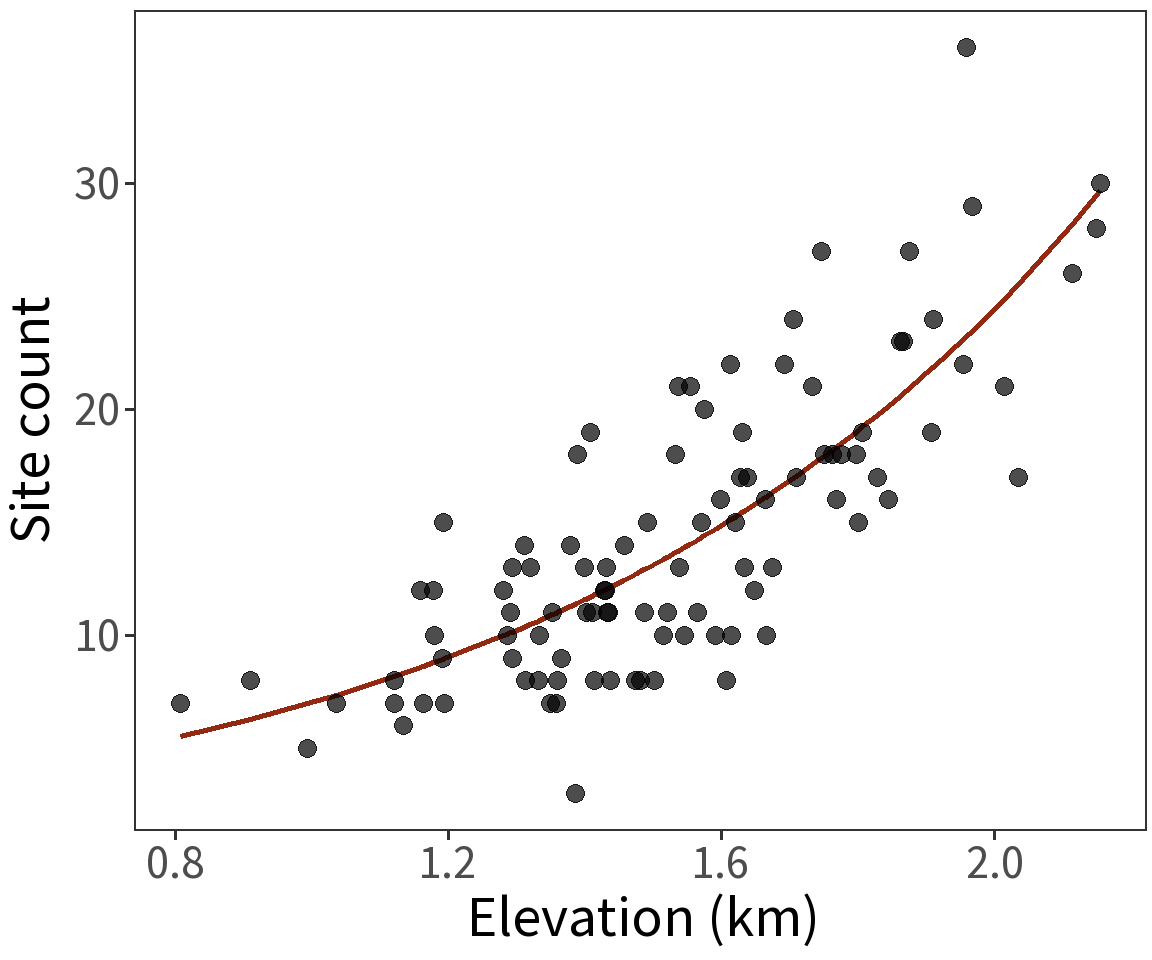 For a one unit increase in elevation, the count of sites increases by 3.4701.